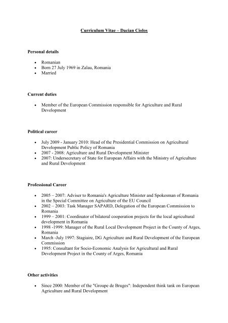 Curriculum Vitae A Dacian Ciolos Personal Details Romanian Born
